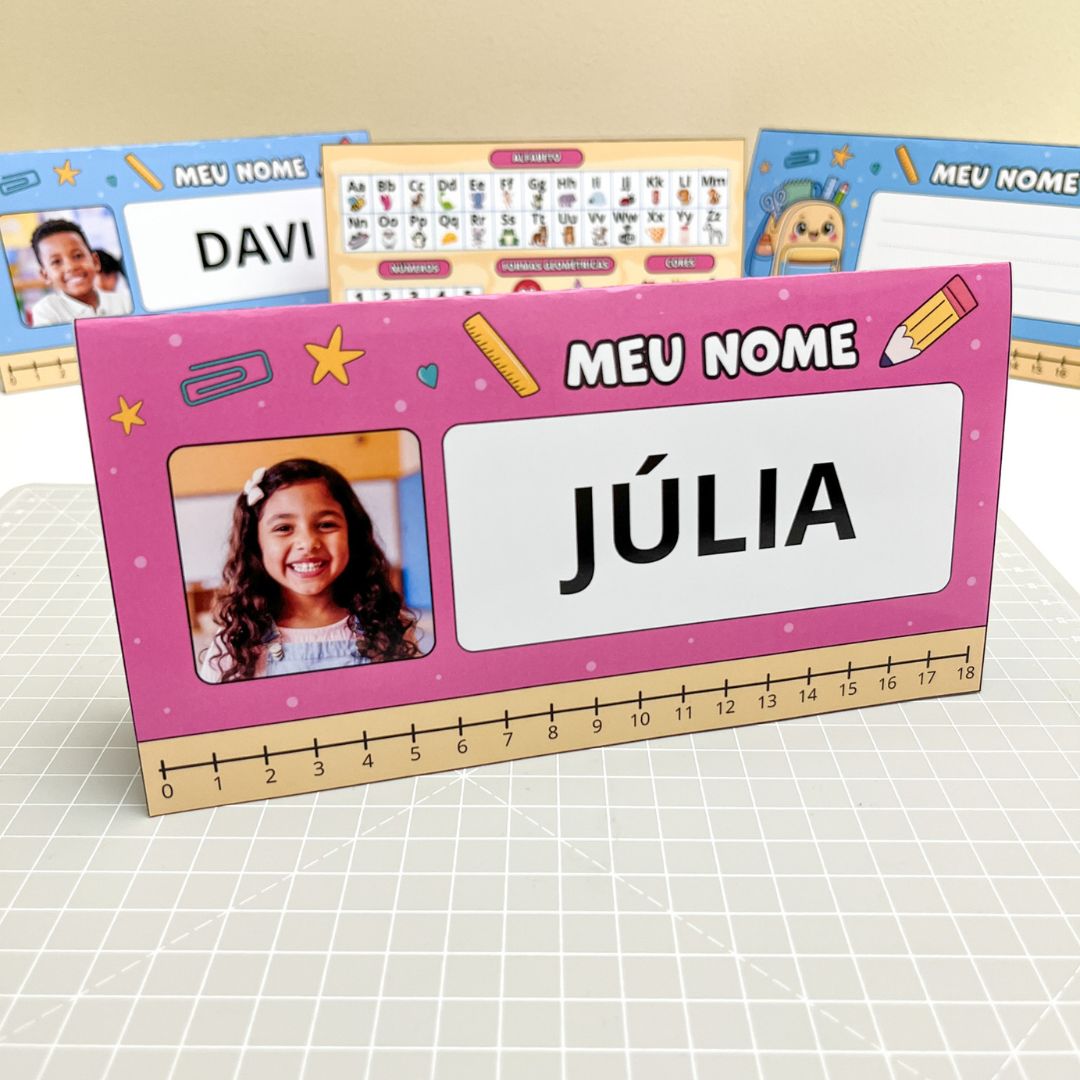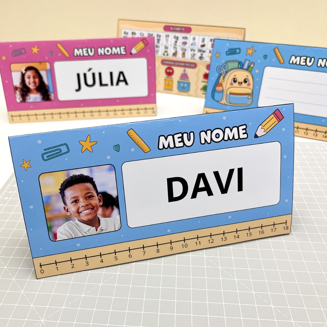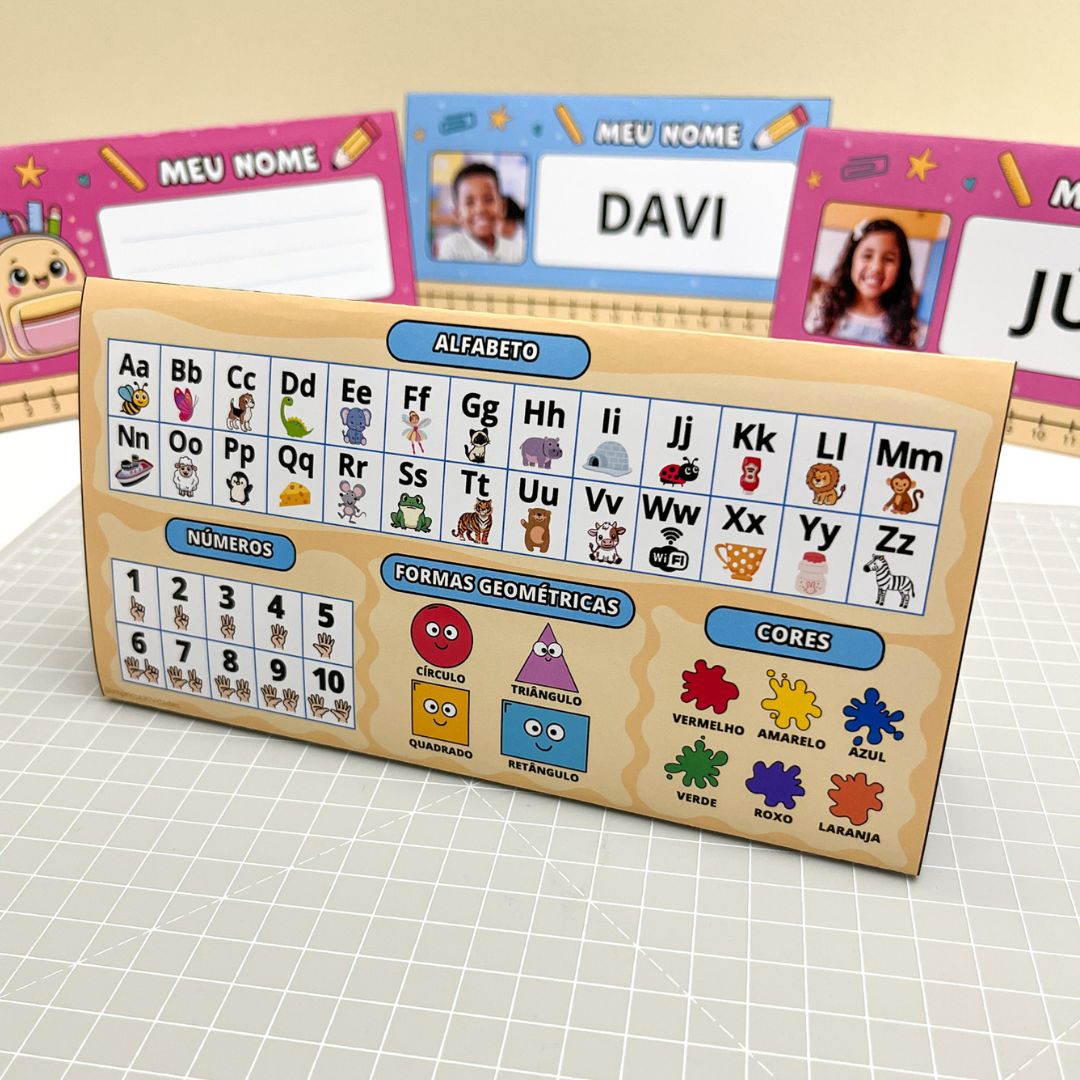 Com um visual colorido e elementos visuais pensados para o ambiente escolar, o crachá permite a personalização com nome e foto de cada criança. Na parte de trás, traz conteúdos pedagógicos de apoio, como o alfabeto ilustrado, números, formas geométricas e cores, servindo como uma referência visual constante durante as atividades.