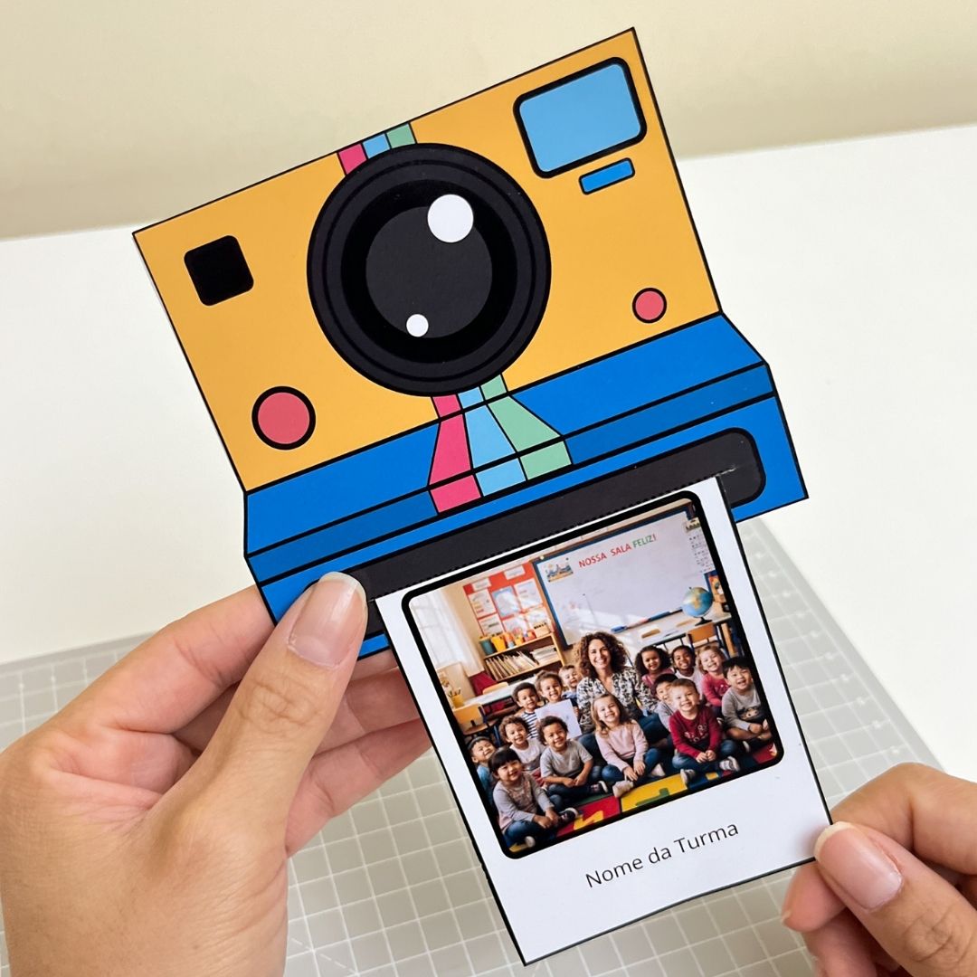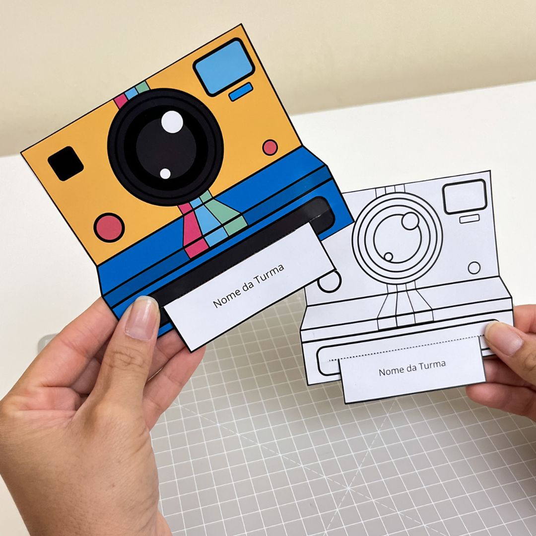Câmera em formato criativo, com espaço para inserir a foto da turma e o nome da sala no Canva. Ideal para entregar como lembrança personalizada aos alunos! Inclui versão colorida e para colorir.