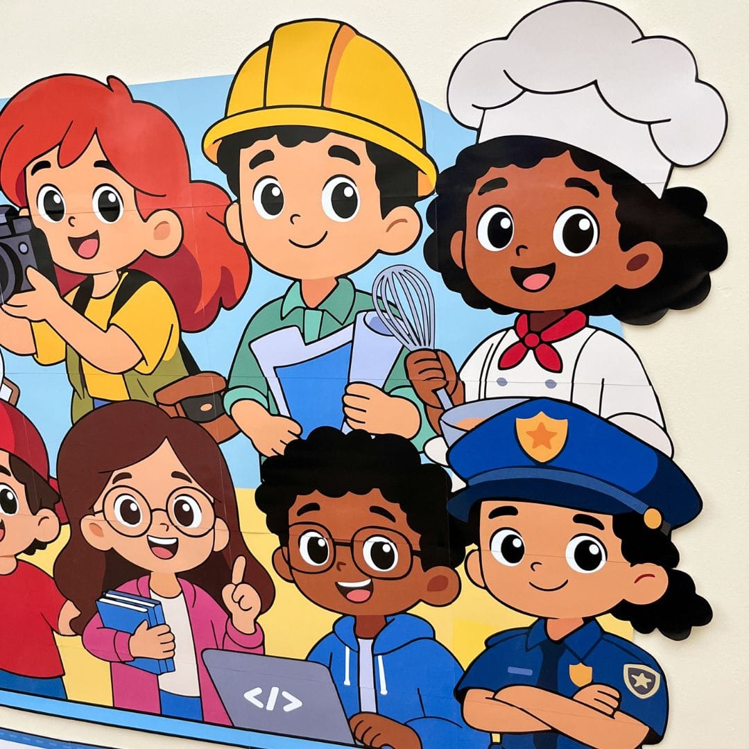 Mural temático sobre profissões.