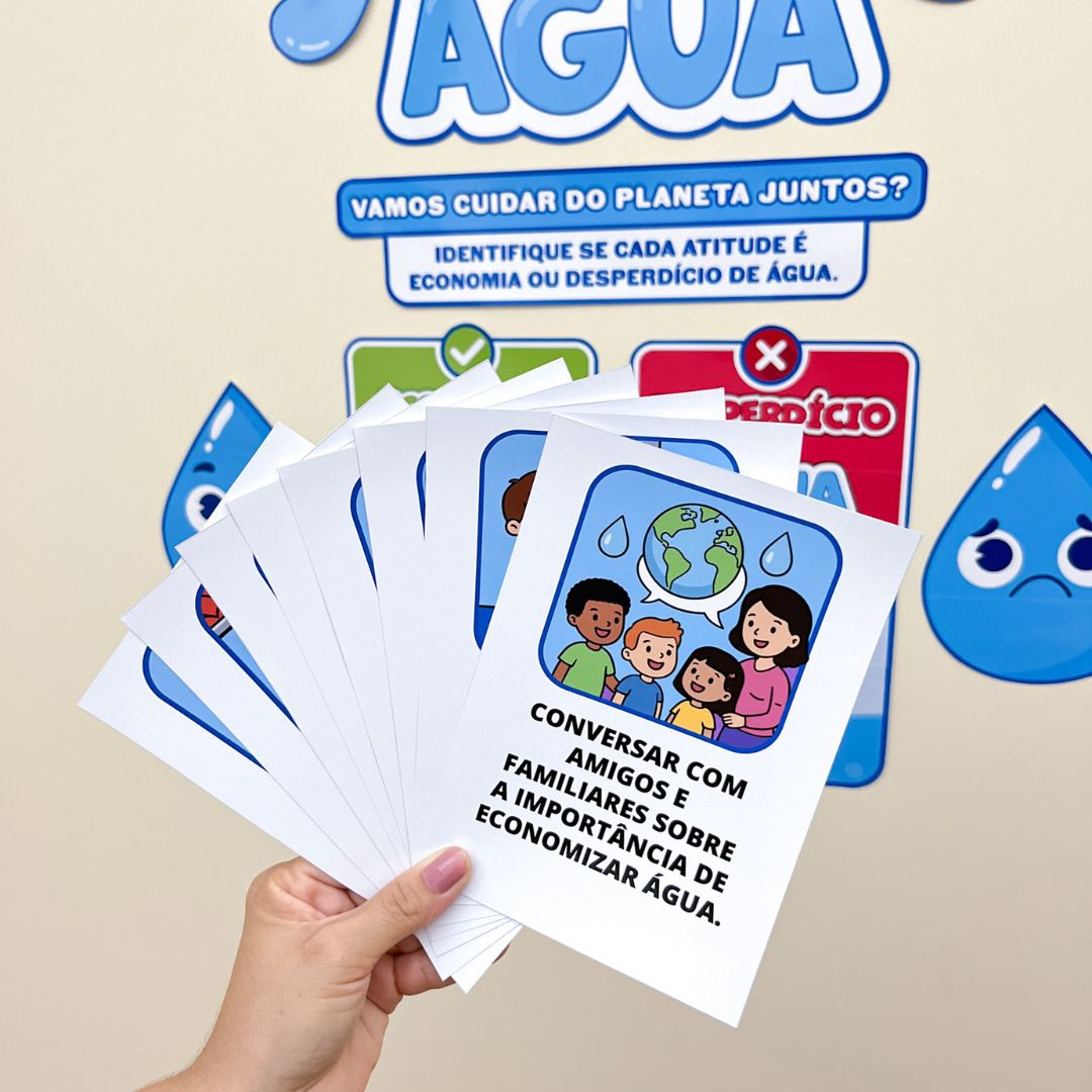 As crianças analisam os cartões com diferentes situações e classificam se representam economia ou desperdício de água, encaixando-os nos bolsos correspondentes. Uma atividade prática que estimula o pensamento crítico e a participação.