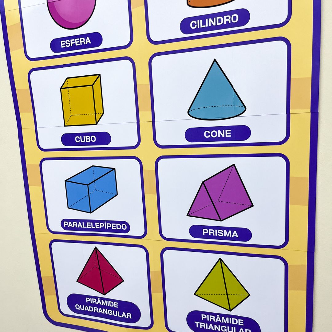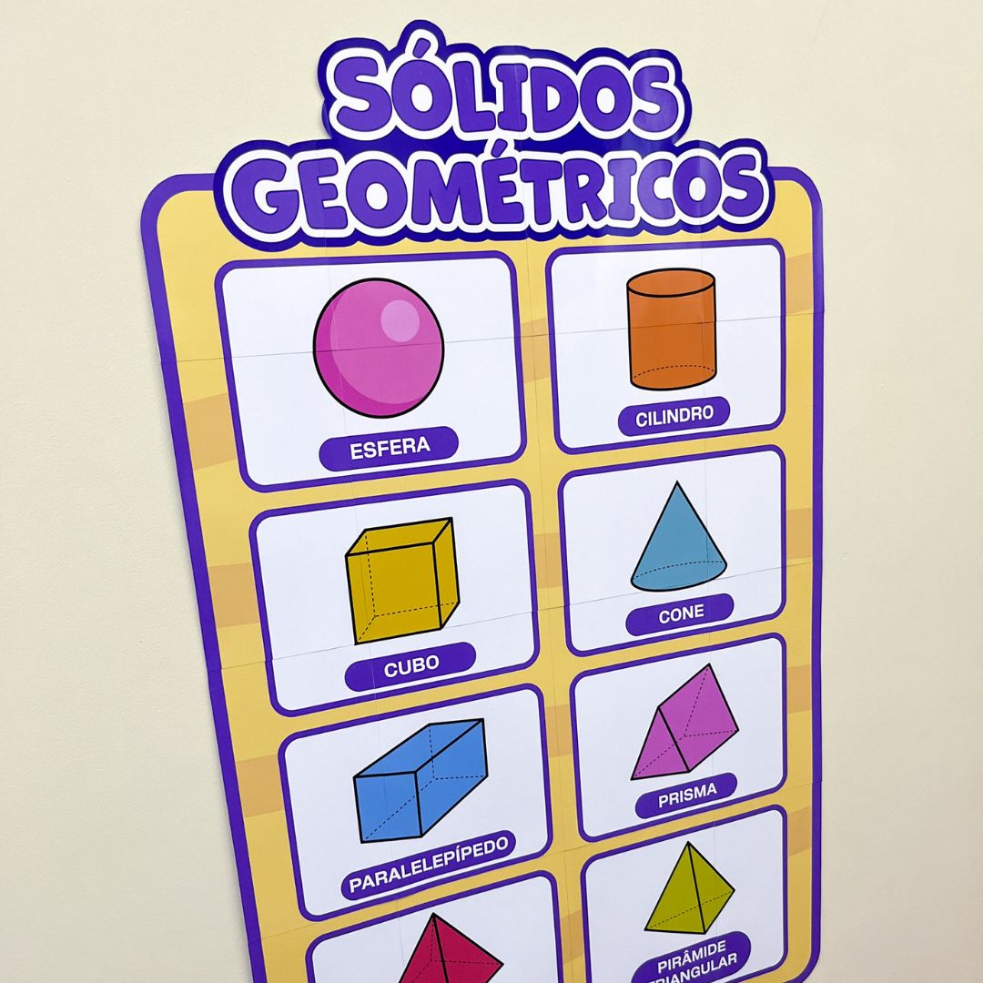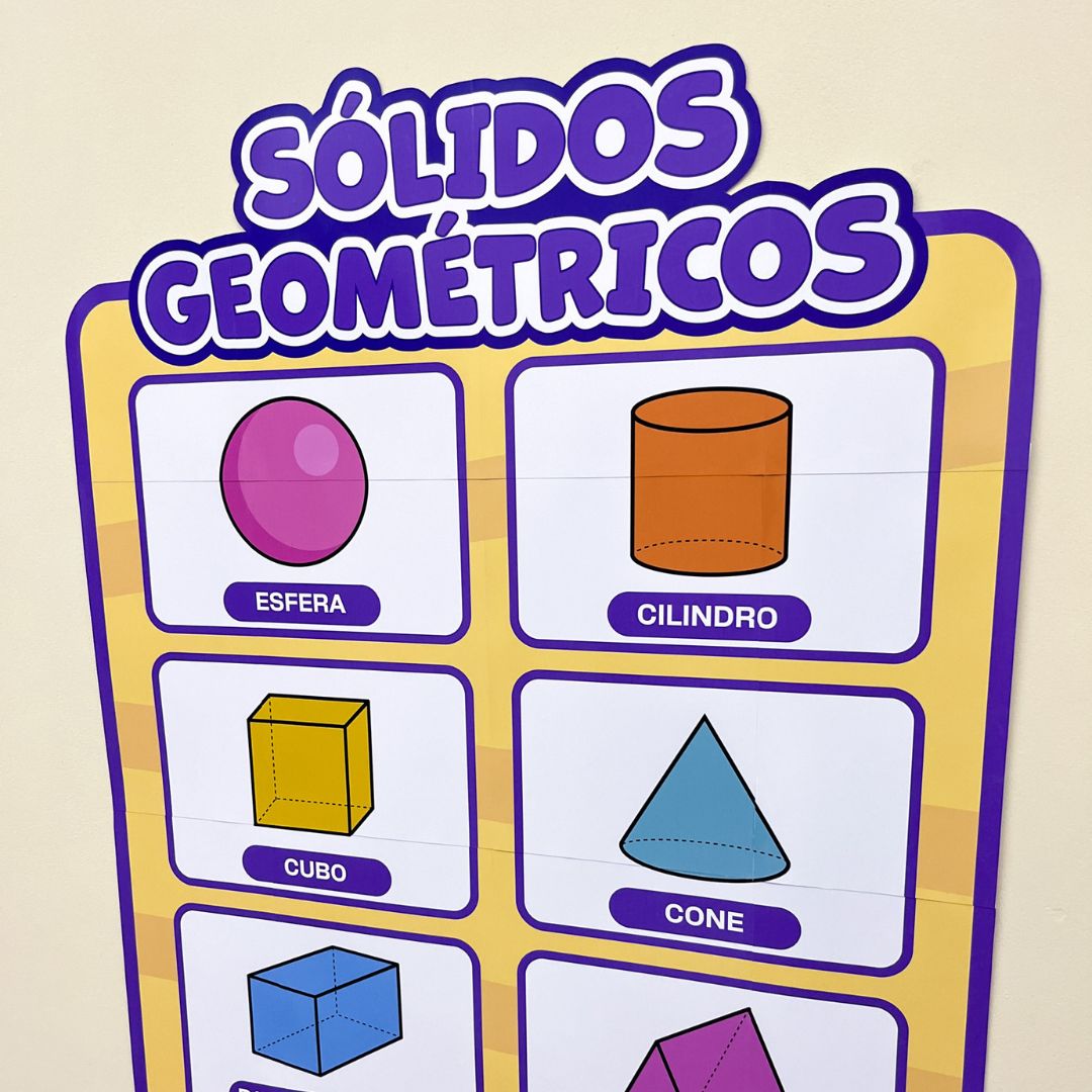 O Painel Sólidos Geométricos foi desenvolvido especialmente para auxiliar professores na apresentação dos principais sólidos em sala de aula. Com um design colorido e atrativo, ele ajuda as crianças a assimilarem visualmente as formas e os nomes de cada sólido.